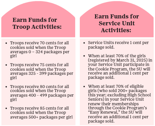 Cookies are sold for $6 per package. In addition to the skills learned and council activities and events, Troops and Service Units get a portion of the proceeds.