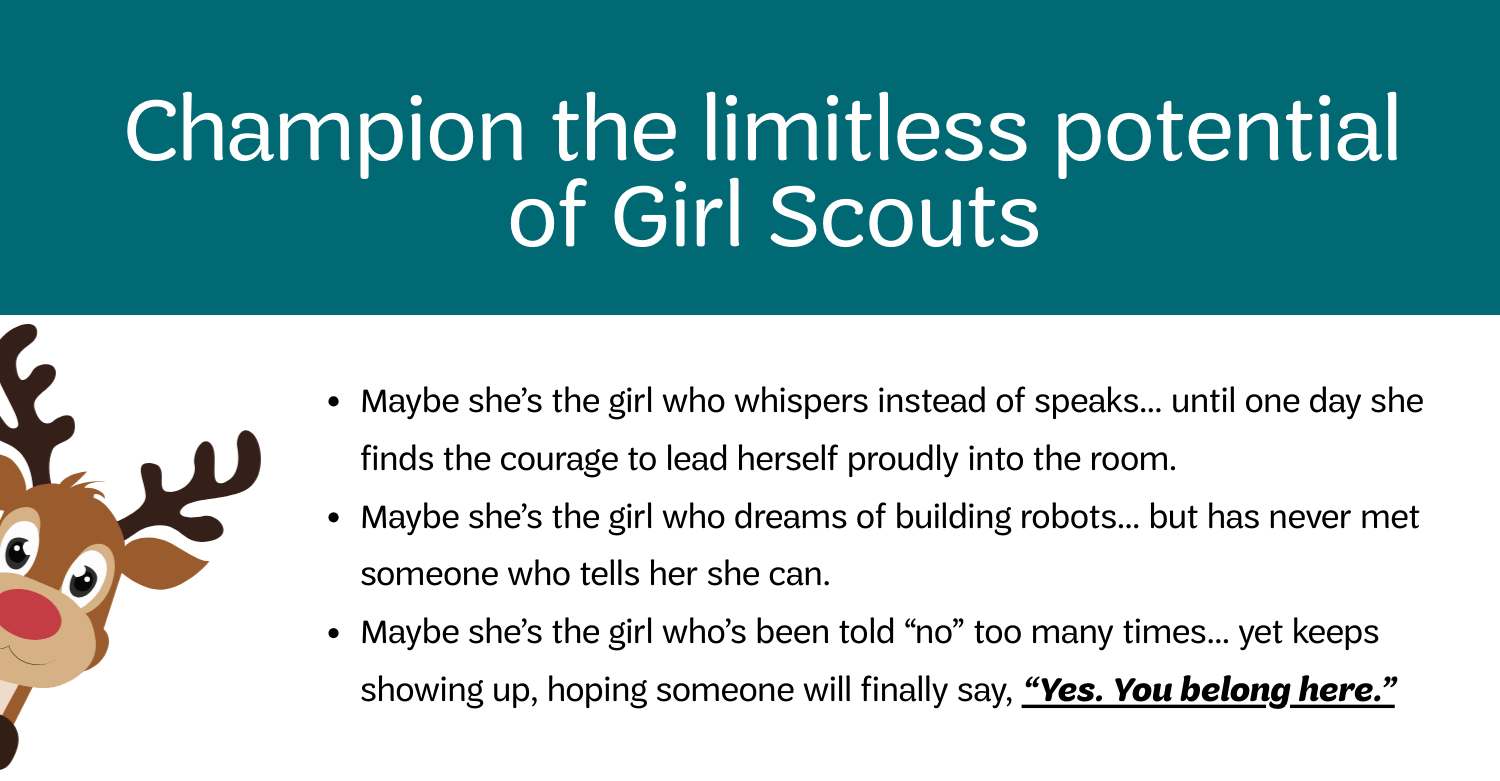 The holidays are a time of light — tiny sparks that grow brighter when we share them. And right now, all across our community, there are Girl Scouts whose sparks are waiting to be nurtured, encouraged, and believed in.
